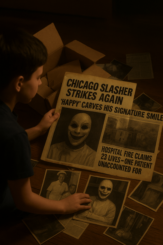“They call him ‘Happy’. And this guy is wearing the mask in all of those photos. He killed your grandmother, and he’s definitely after you, but why?” Joanne asked Eddie as he just stared at the newspaper giving him a name, and that a fire killed people years ago, and that only one patient was never found.