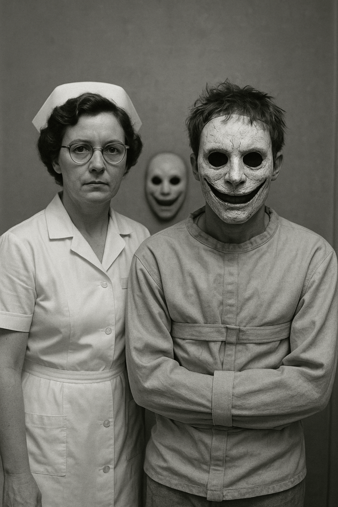 “Are you ready for the real fright fest, boys and girls? Because do I have a treat for you. Just now, something came into my possession from one of my most sadistic fans. This will give your kids’ kids nightmares,” Jerry Koz shouted from the television with the most sadistic laugh. He hid his face long enough to reveal a dirty, somewhat tattered and broken, porcelain mask with black holes for eyes and teeth, somewhat faintly pained on.